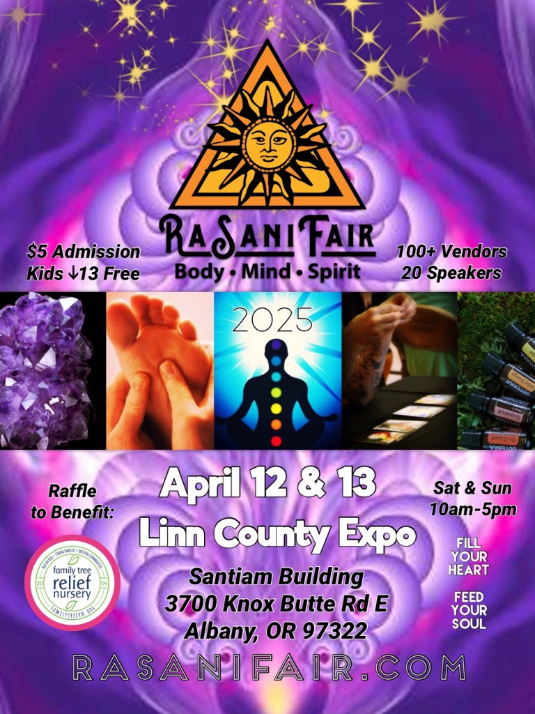 Vickie is also the organizer and producer of the RASANI FAIR. Oregon’s largest premier body mind spirit holistic fair that happens every October and April. Family friendly and full of good vibes. Bringing together a large variety of alternative and holistic independent practitioners, high quality artisans, creative craftsman, metaphysics and more to elevate your personal spiritual journey. Whether you are new or a lifelong seeker, you will find the RaSani Fair an enjoyable and inspirational experience. Next fair is April 12 & 13, 2025!